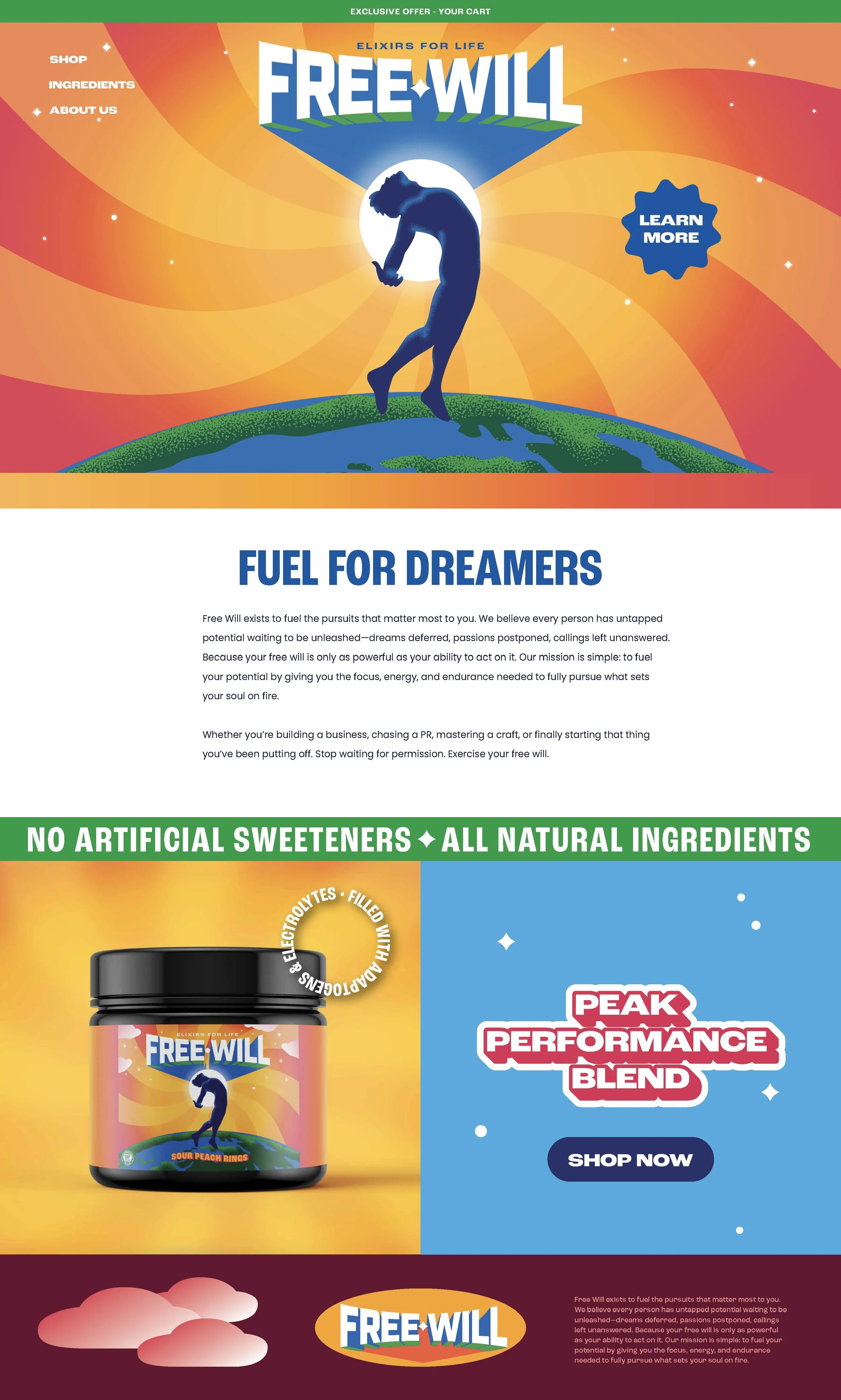 BRANDING / ILLUSTRATION / LOGO DESIGN / PACKAGINGFree Will is a supplement brand aimed to energize you on your next great adventure. I designed the visual identity to evoke the freeing feeling of hitting flow state and the calm confidence that you can take on whatever life throws at you.